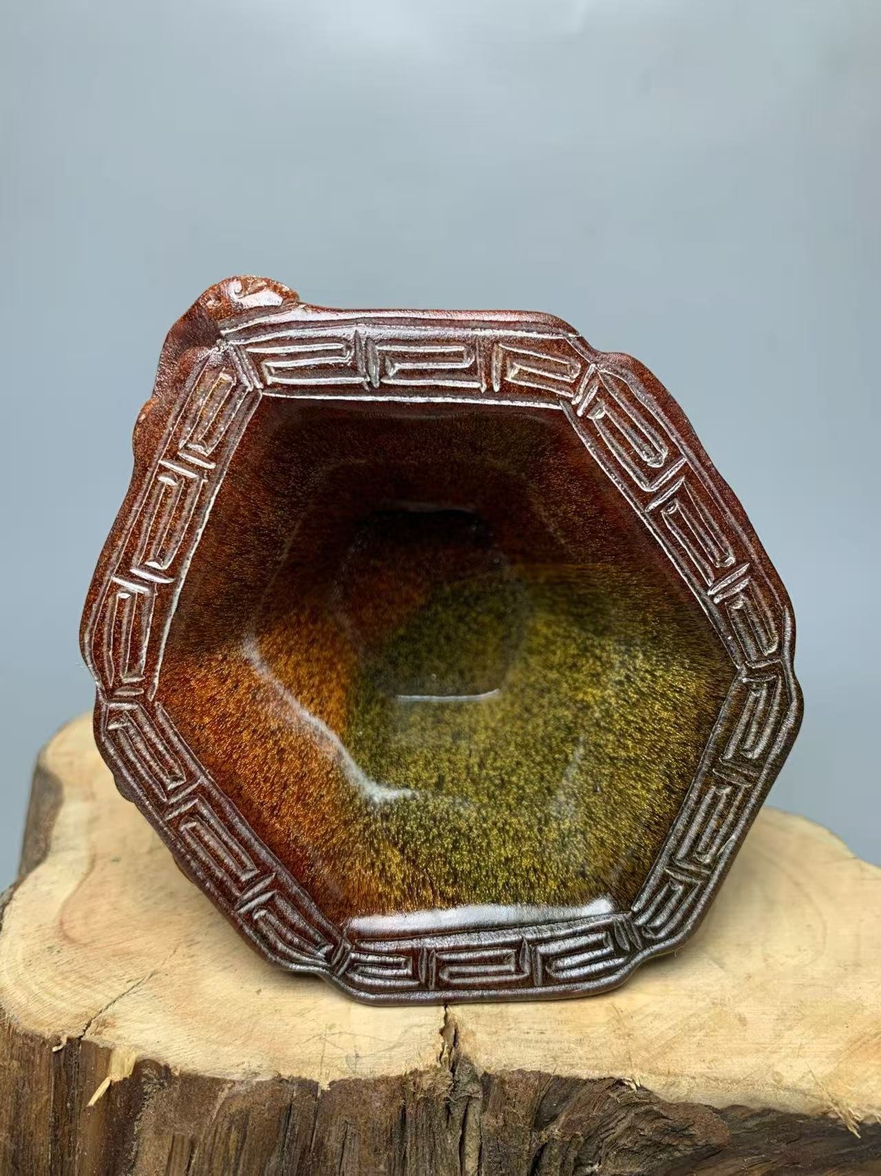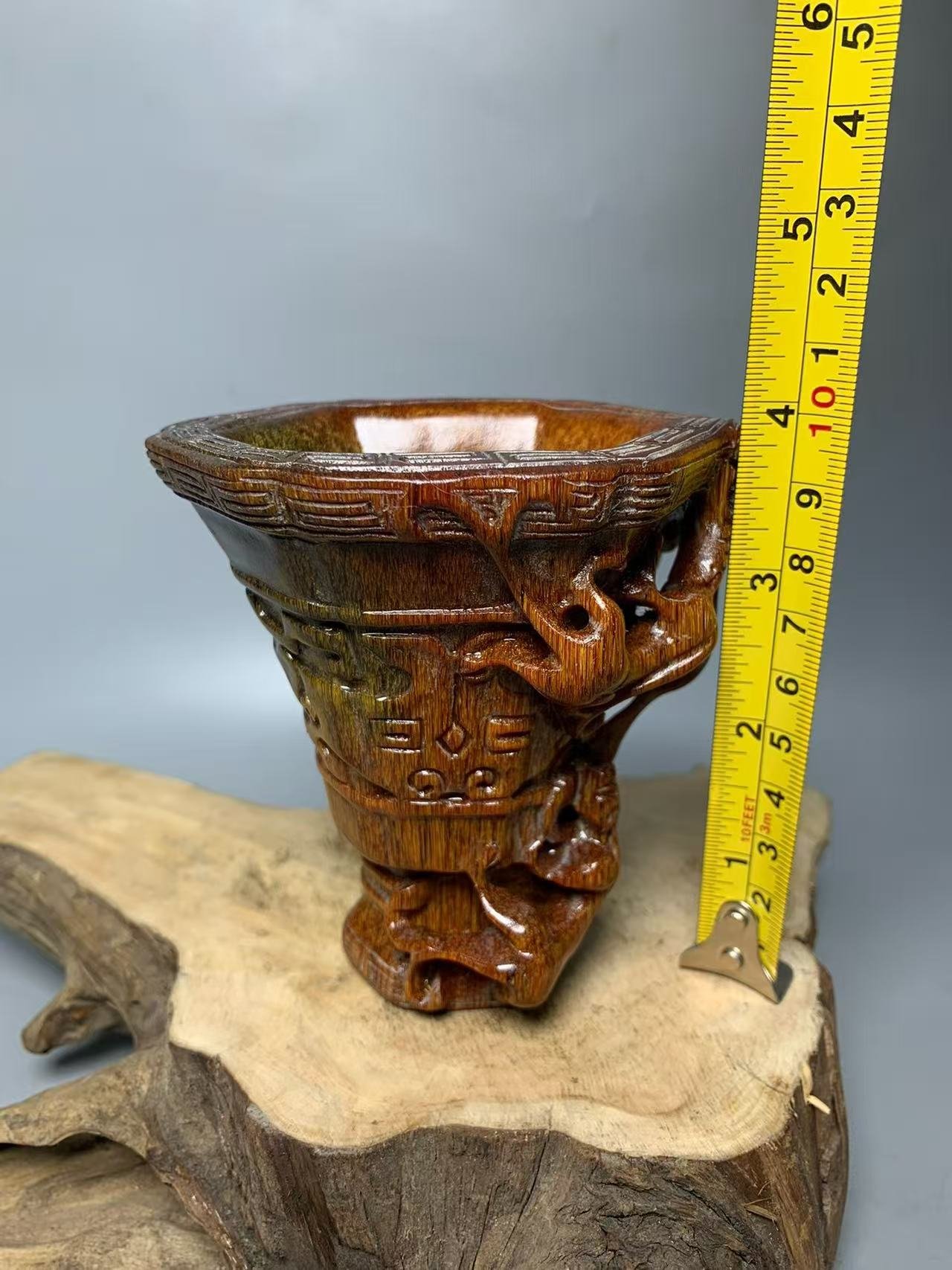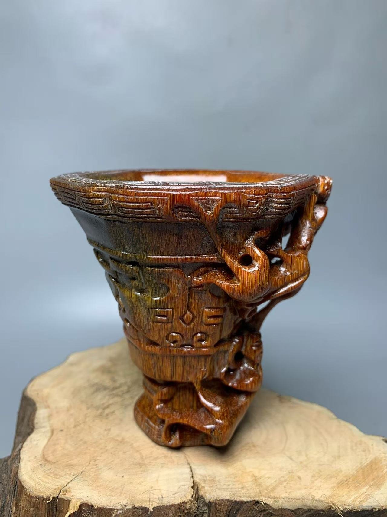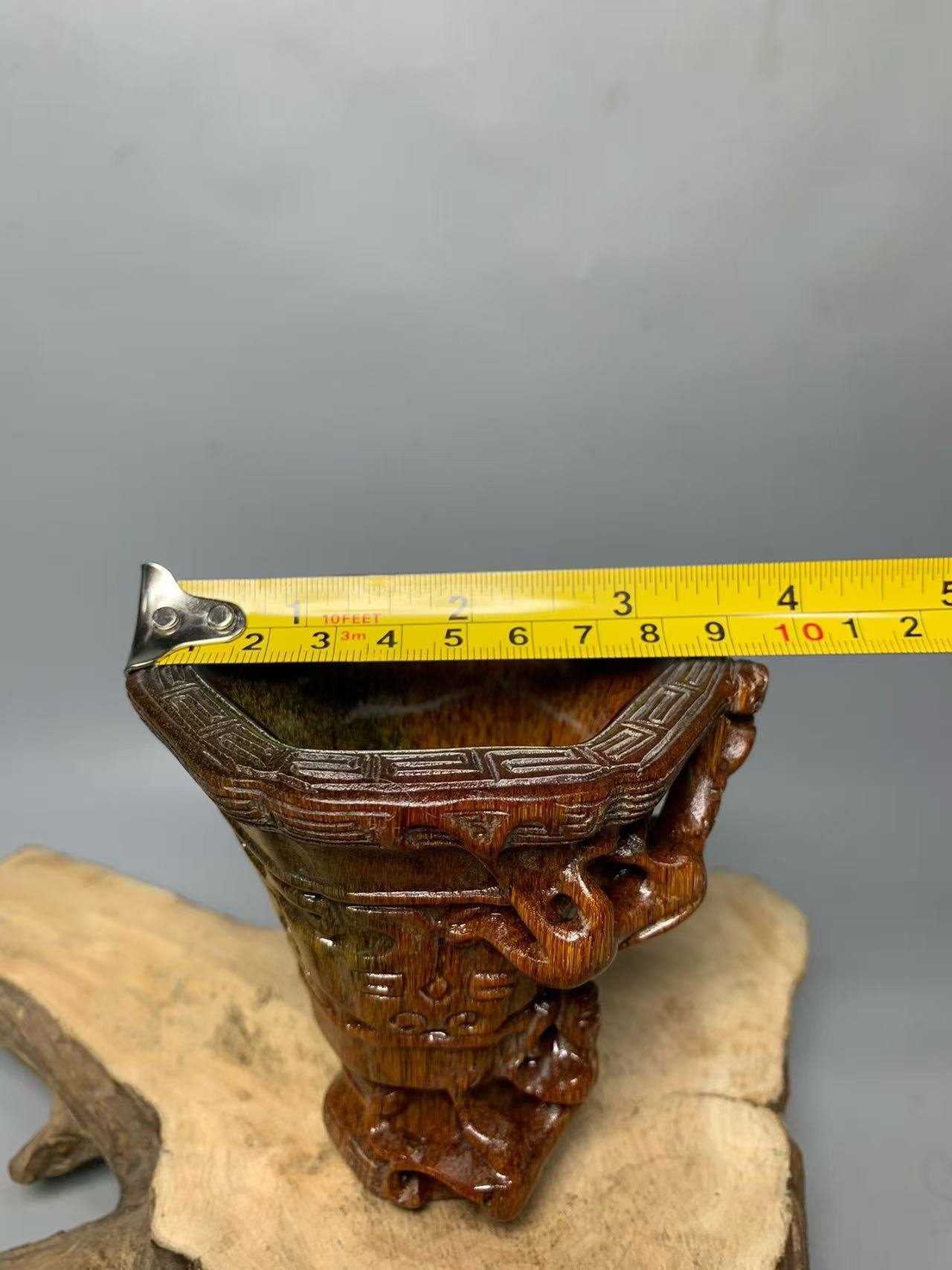 This exquisitely hand-carved ceremonial cup exemplifies traditional craftsmanship at its pinnacle. The horn’s natural “hairy striations” and “caviar grain” patterns are accentuated by: