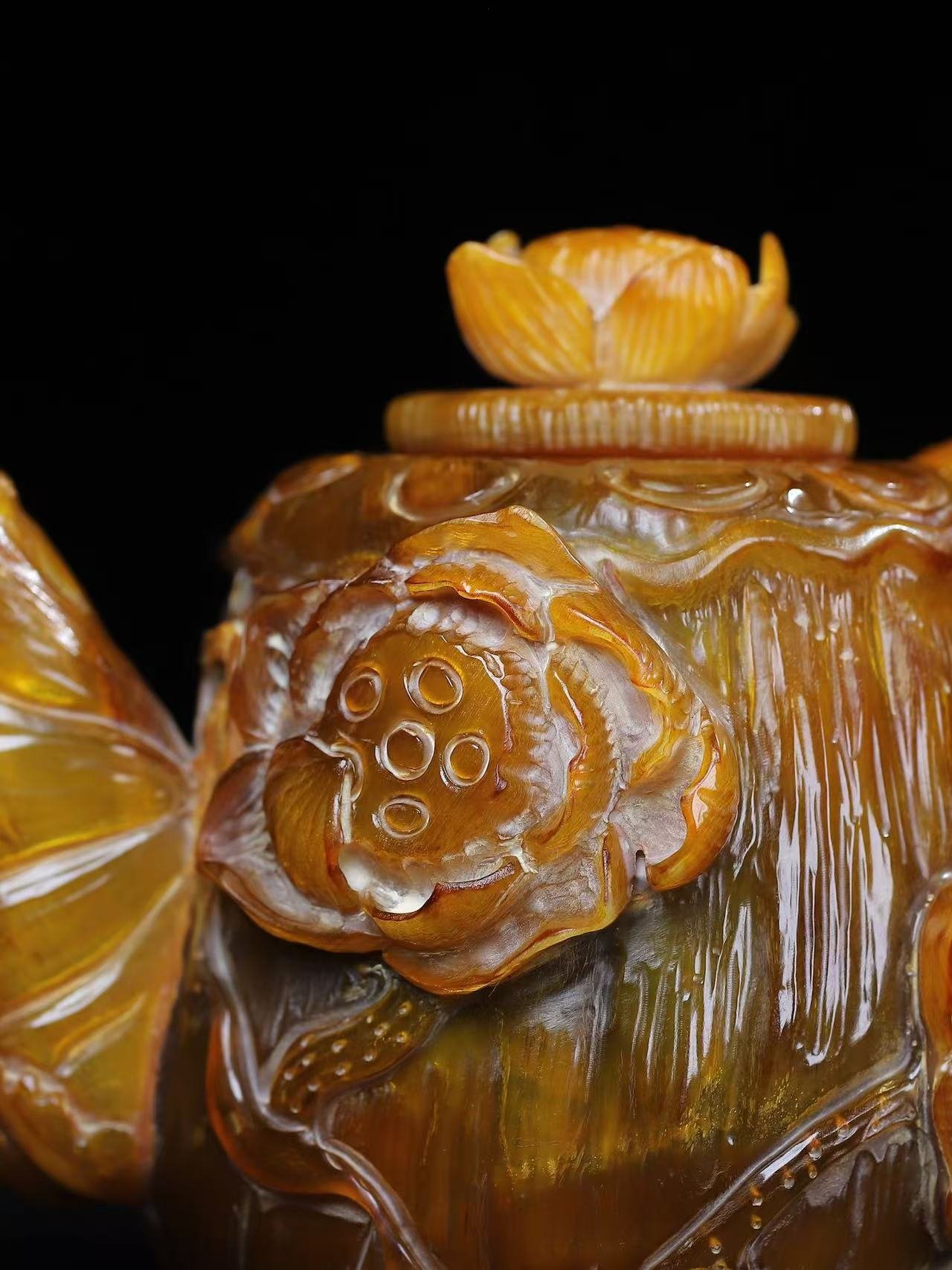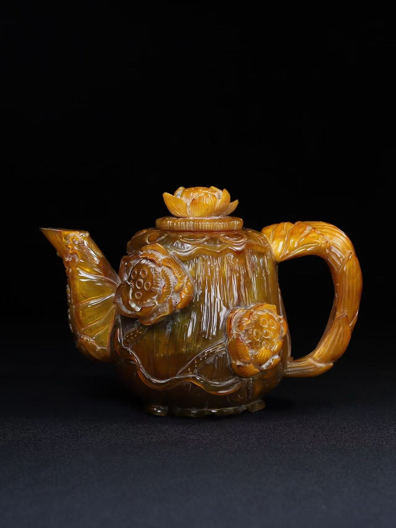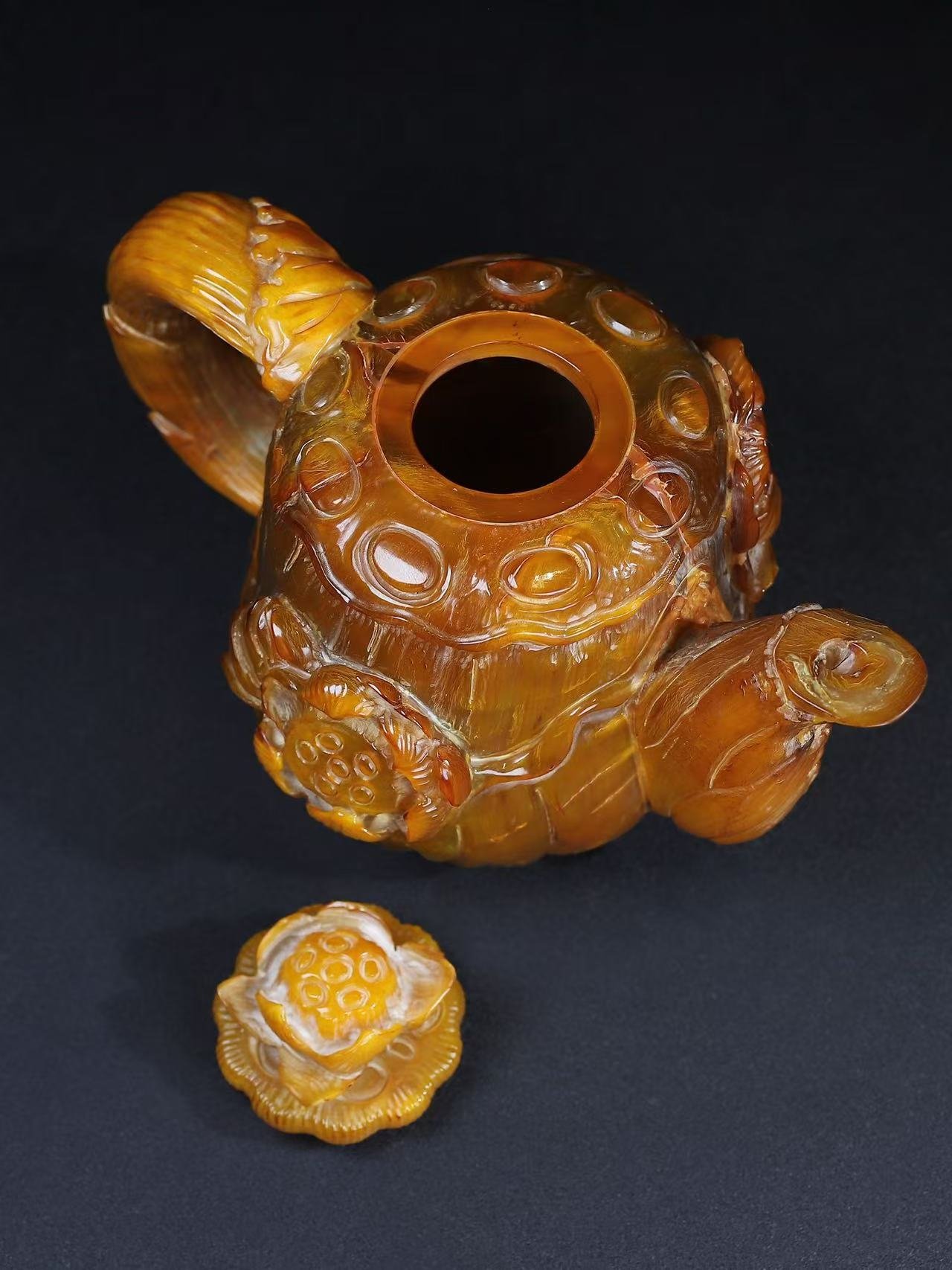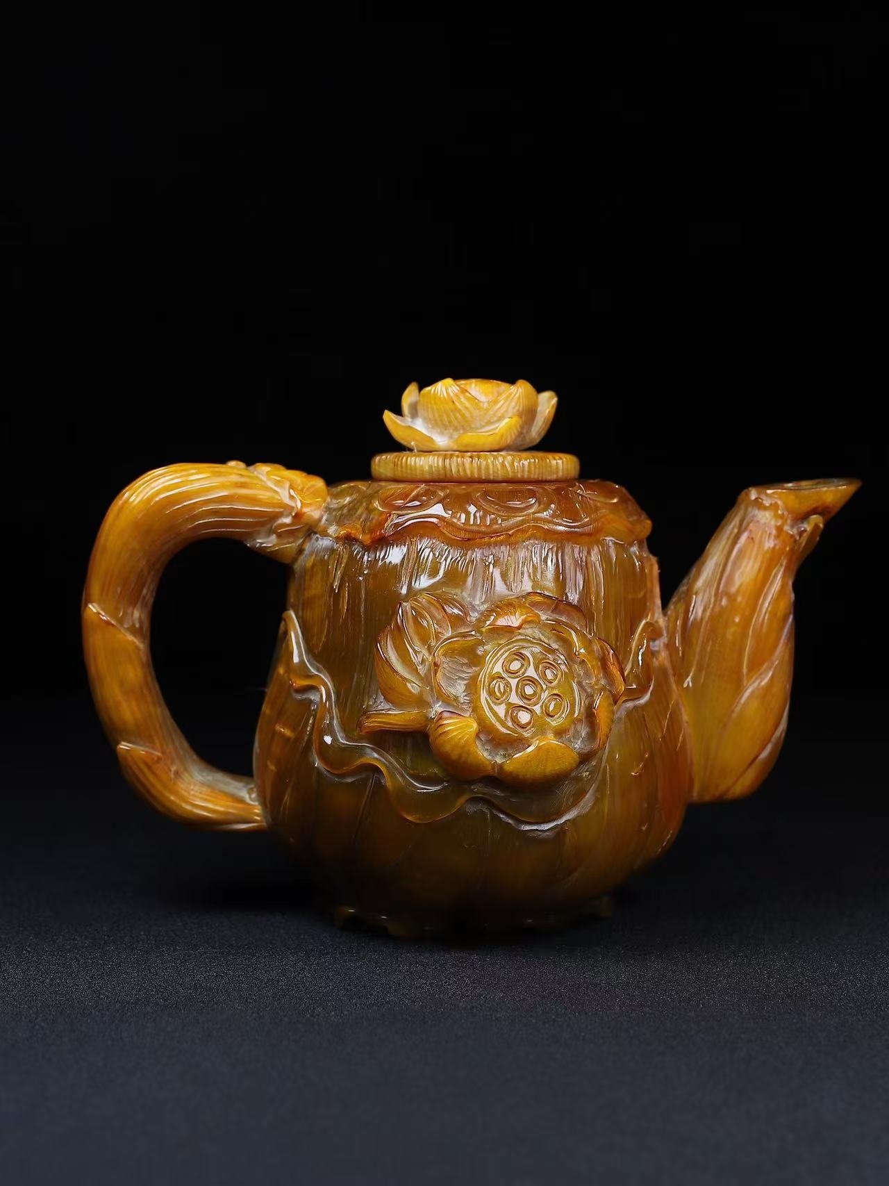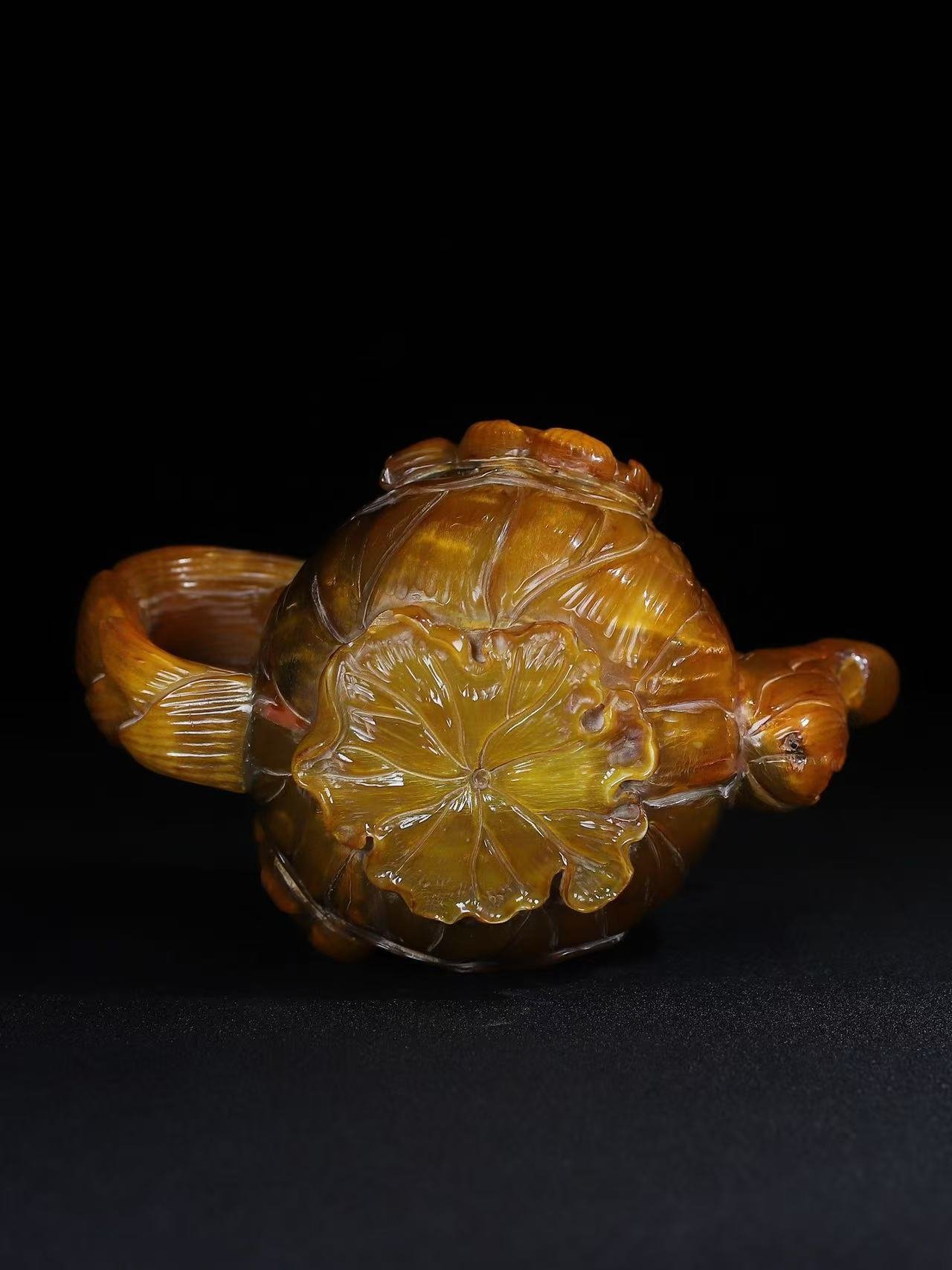 This exceptionally rare hand-carved rhino horn teapot embodies the pinnacle of Qing Dynasty artistry. The vessel features: