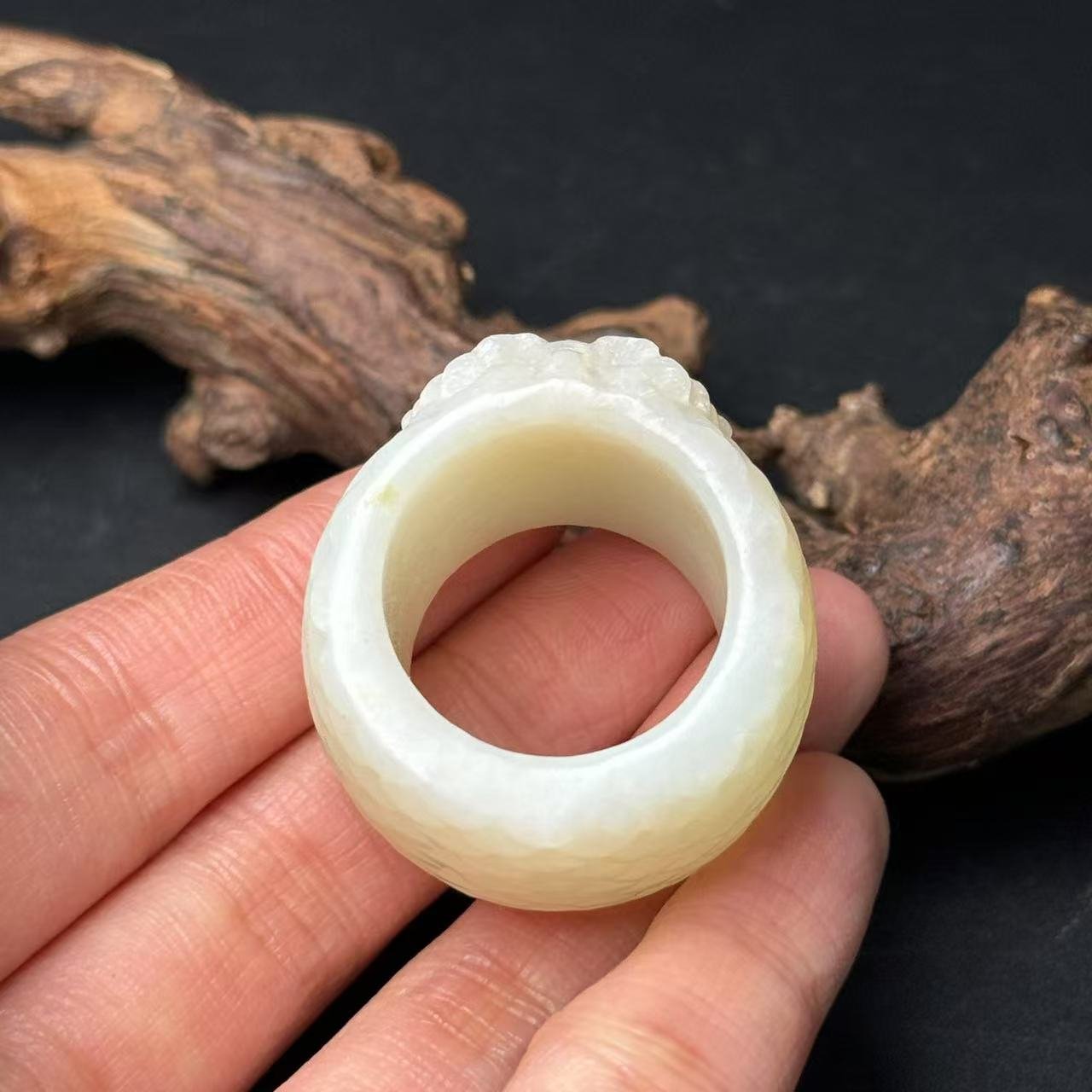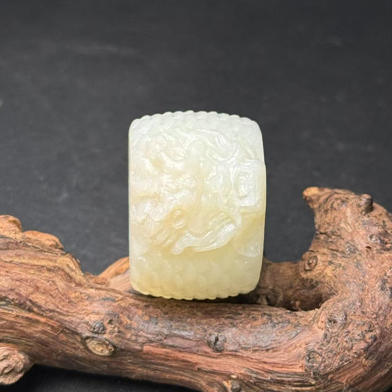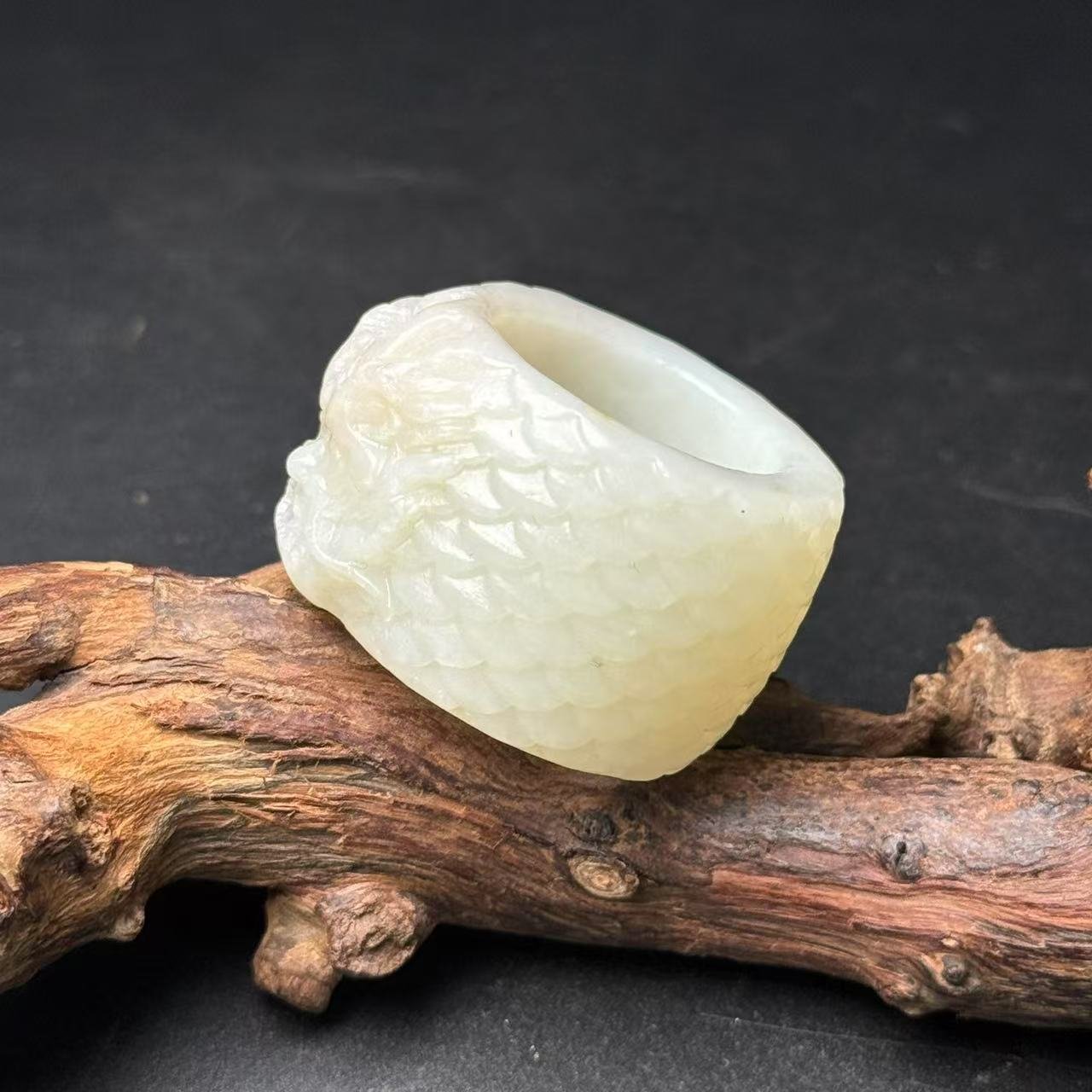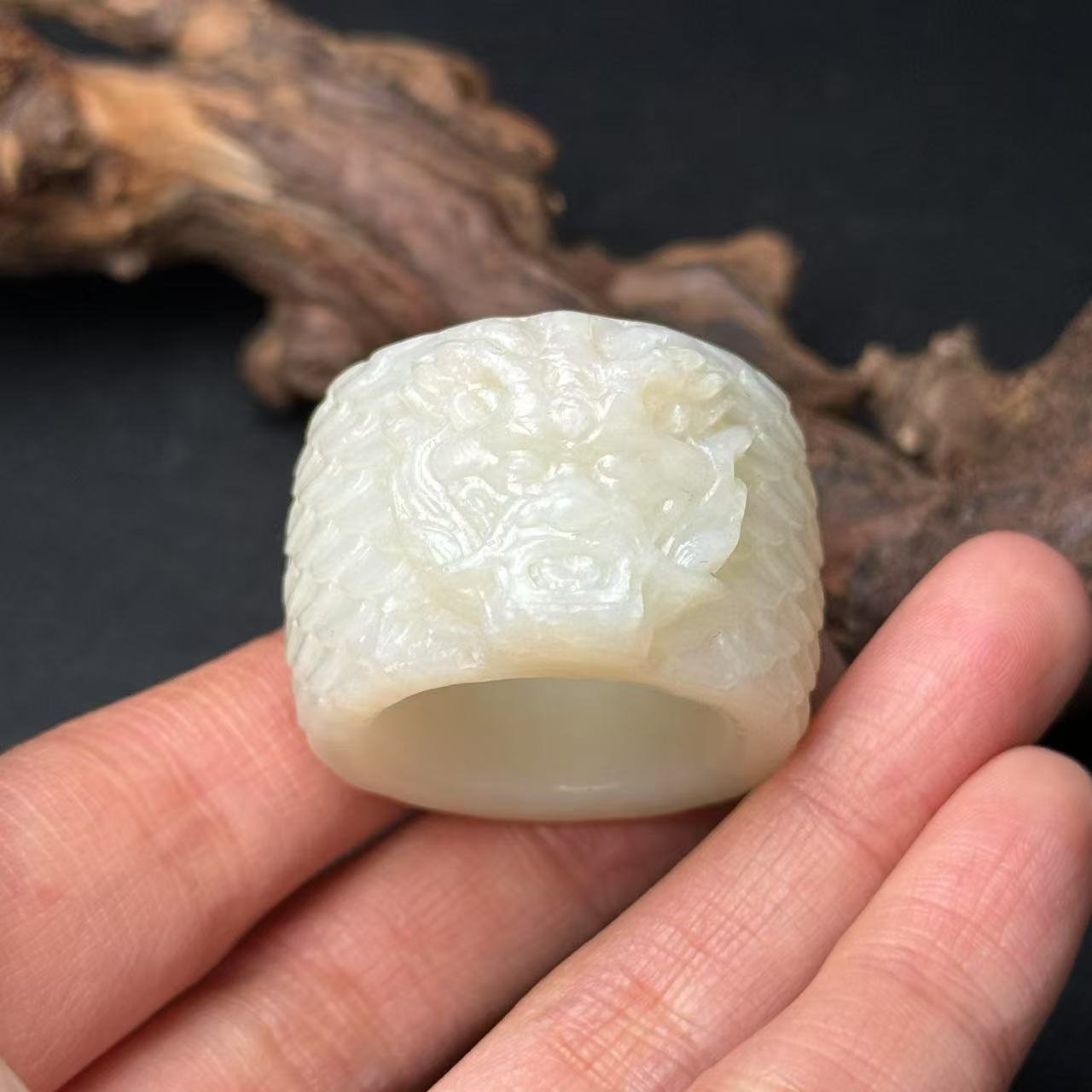 Carved from premium Hetian jade, this dragon-head thumb ring embodies imperial authority with its intricate scale patterns and commanding presence. The veteran carver’s blade work brings the mythical beast to life, its sinuous body coiling around the wearer’s thumb—symbolizing dominance and celestial favor.