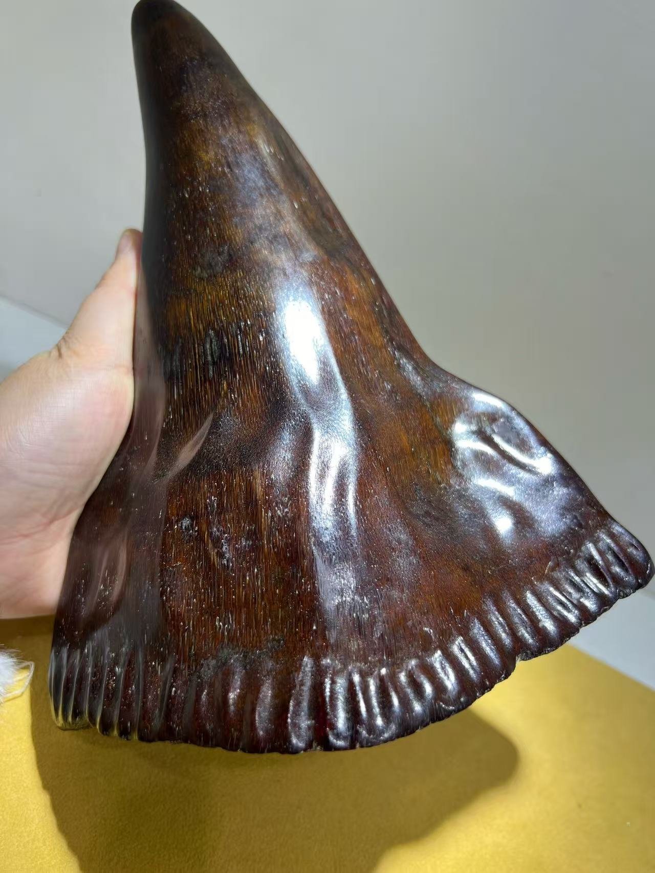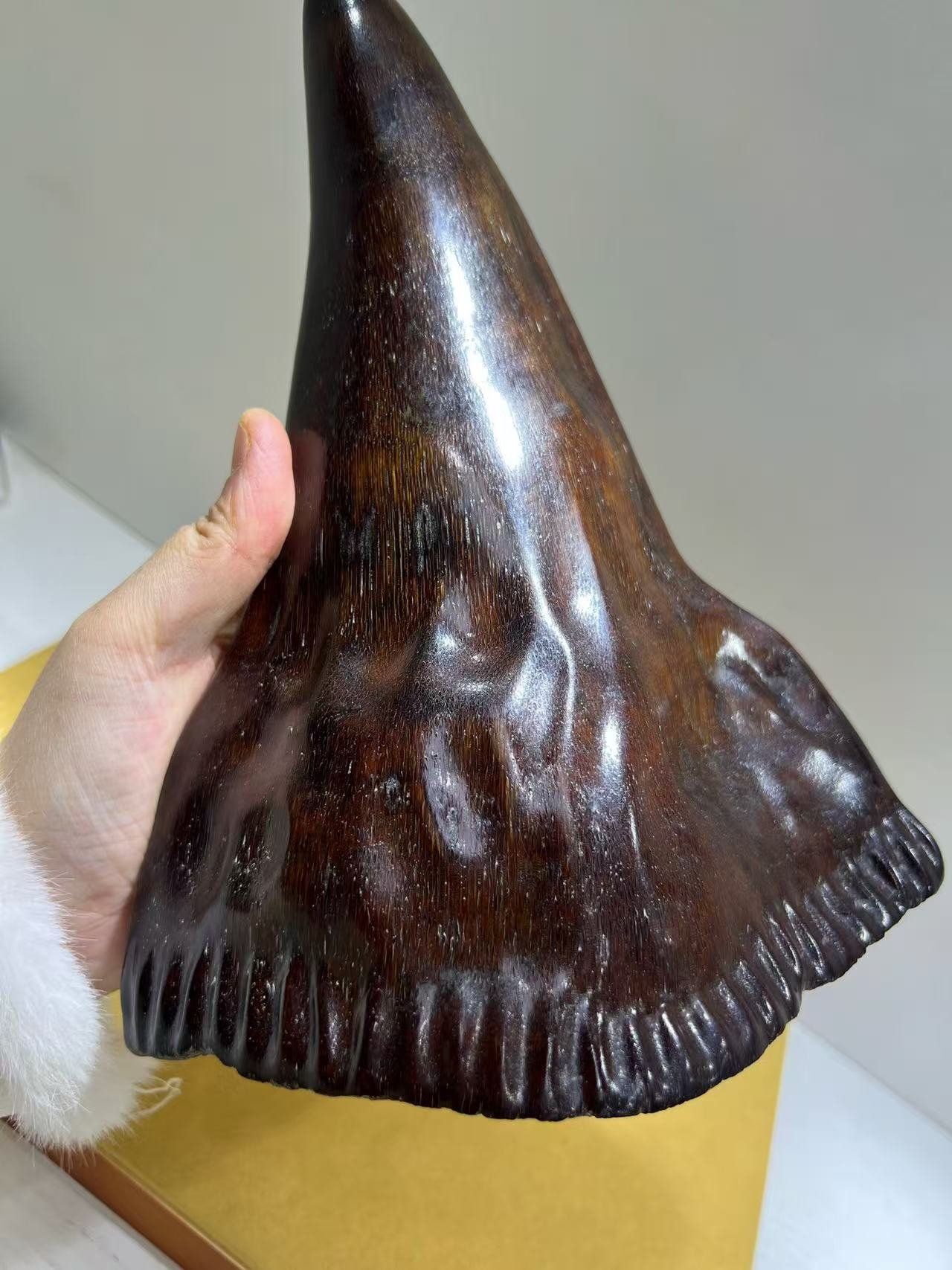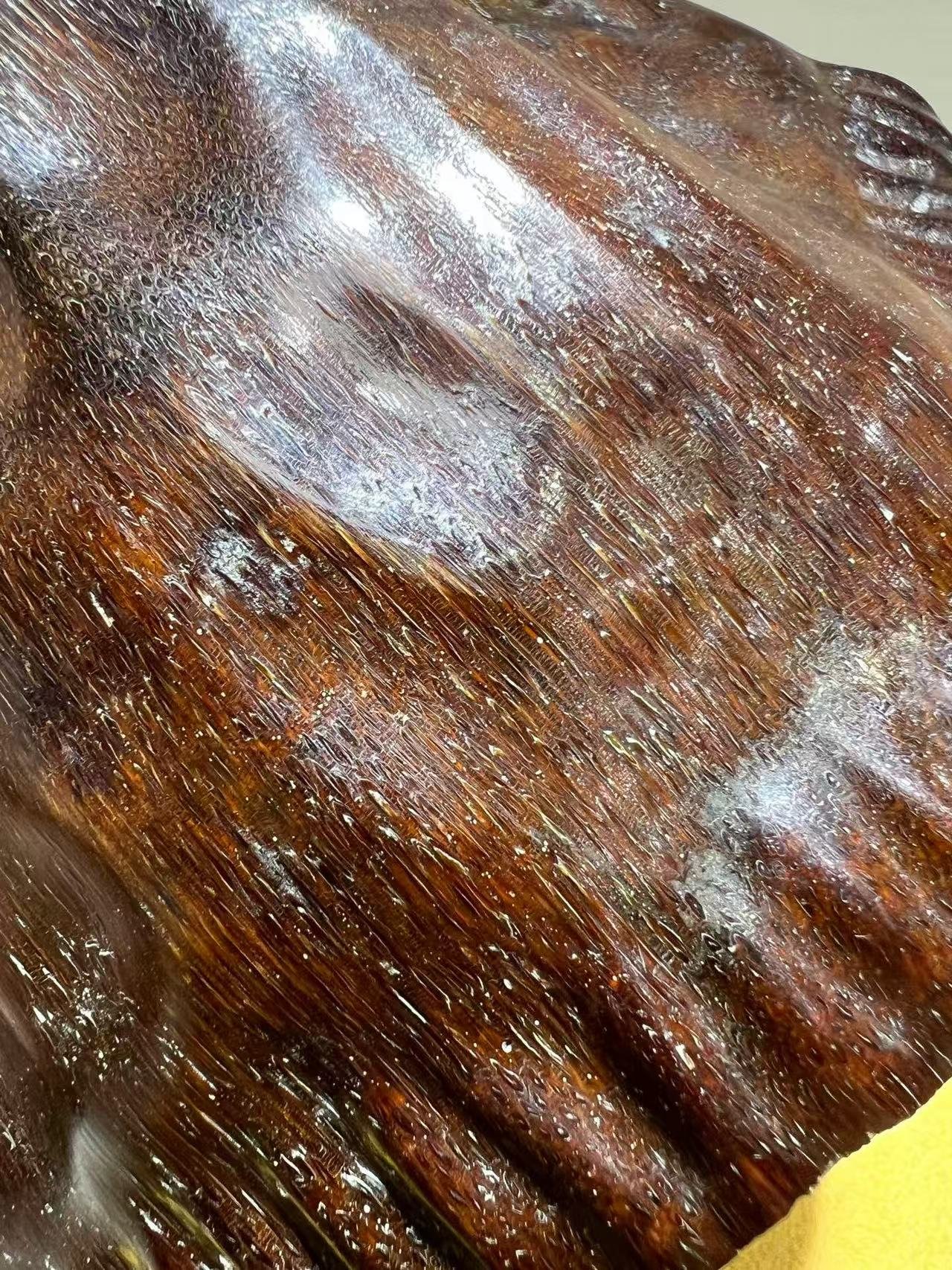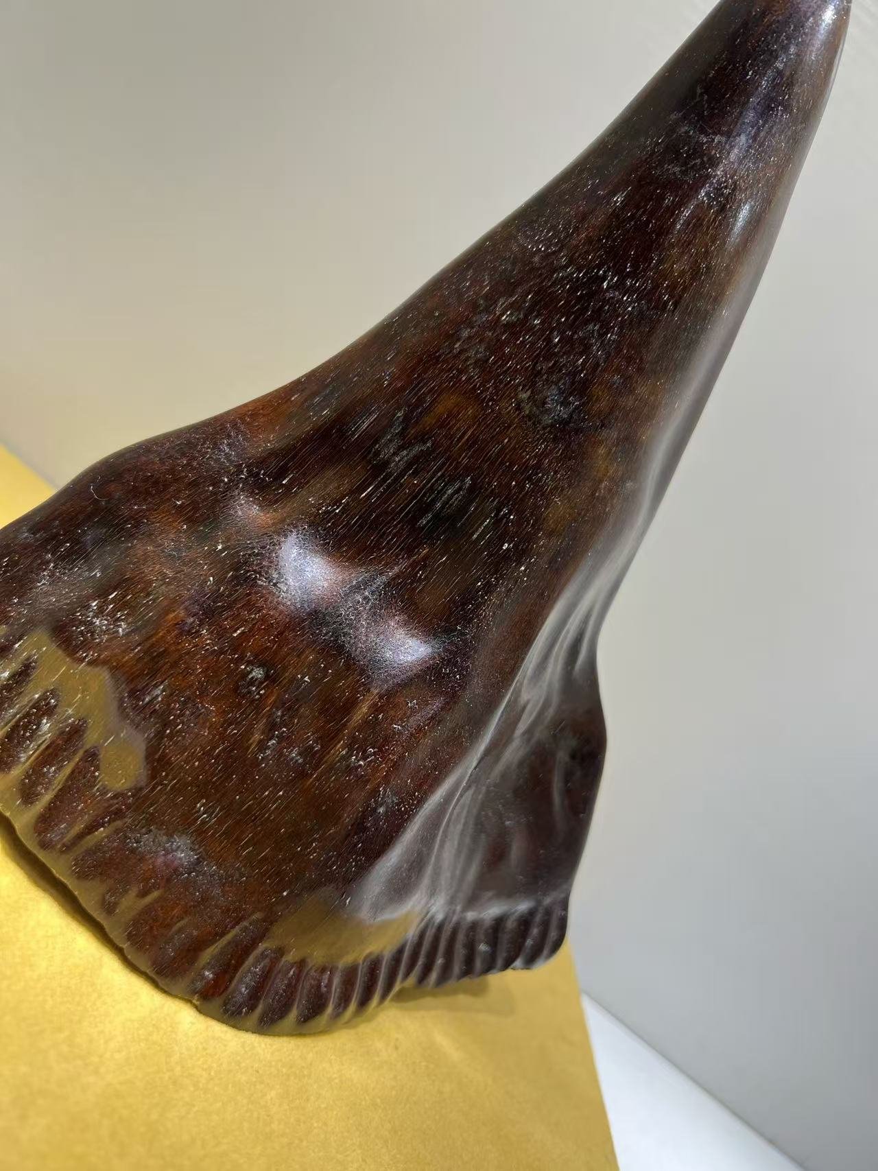 An unparalleled collectible, this authentic, non-composite rhinoceros horn is a true masterpiece of nature—prized for its thick, lustrous patina and impeccable preservation. Carved from vintage “red skin” material, its intricate grain patterns ripple with hypnotic clarity, embodying centuries of cultural reverence.